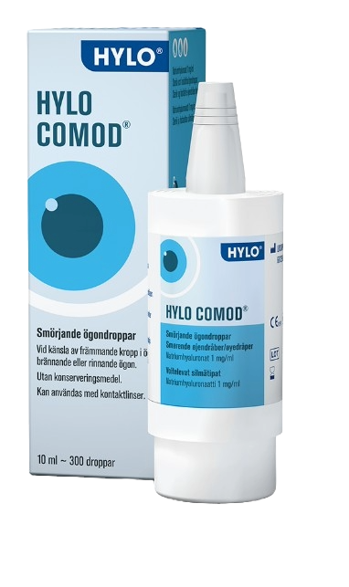 - Hylo Comod – Innehåller högmolekylär hyaluronsyra som ger återfuktning och lindring vid torra och irriterade ögon. För lätta och medelsvåra besvär. Kan användas samtidigt som kontaktlinser.