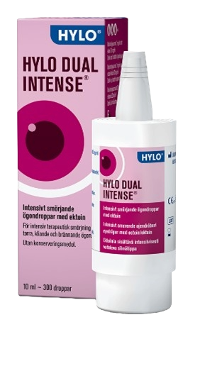 - Hylo Dual Intense – Innehåller en kombination av högmolekylär hyaluronsyra och ektoin som ger en intensiv återfuktning och lindring samt skyddar tårfilmen från att avdunsta för fort. För mer uttalade besvär, kroniskt torra ögon och inflammatoriska symptom.