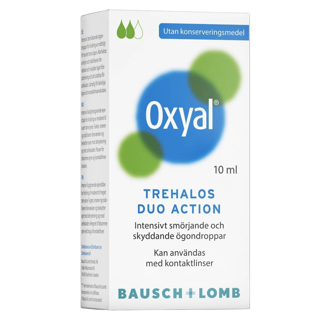 Oxyal Trehalos Duo Action – En droppe som tillför fukt. Passar dig med medelsvåra till svåra besvär av torra och irriterade ögon. Innehåller en kombination av trehalos och högmolekylär hyaluronsyra.